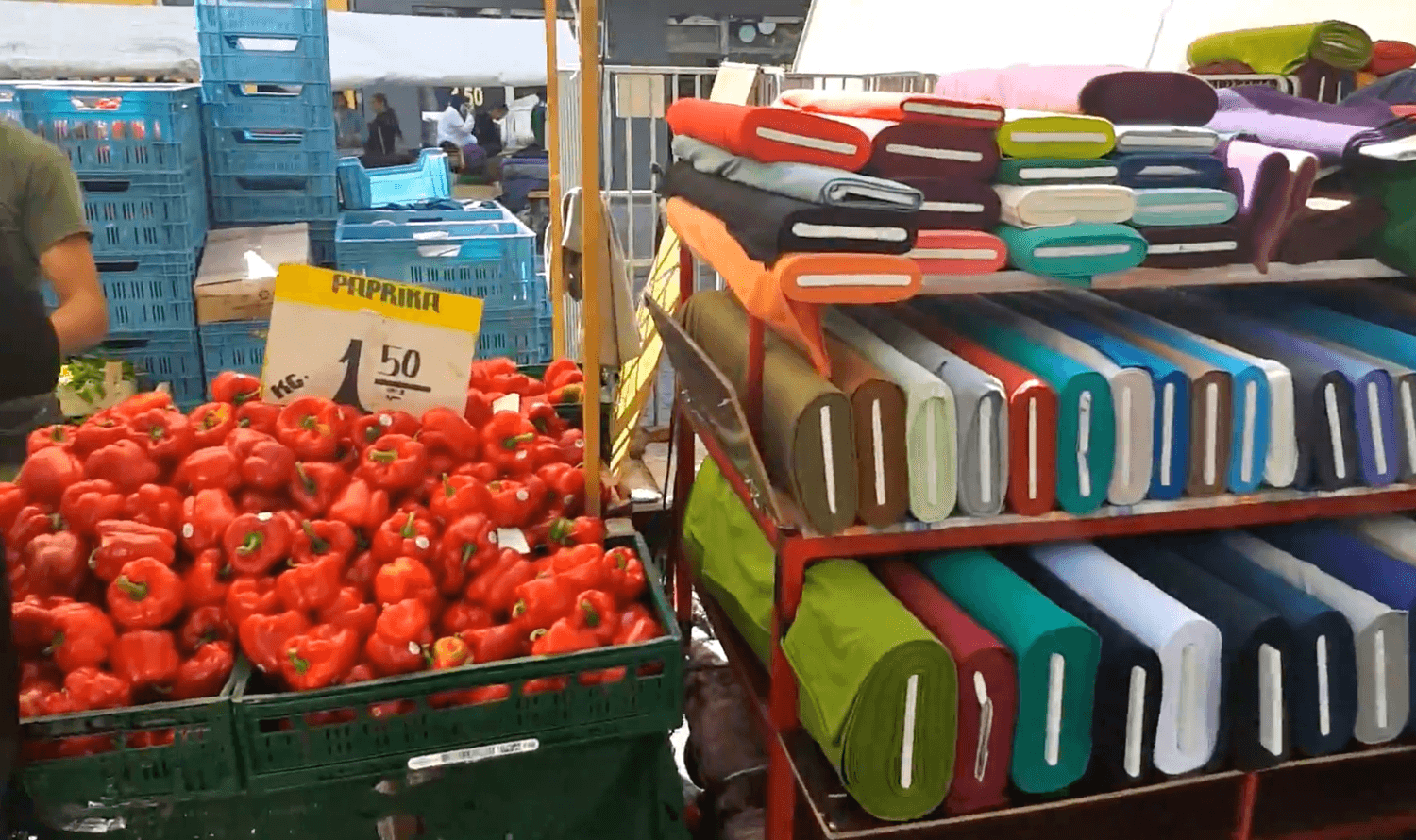 Wow! What a mish-mash of fruit and veggies and food stalls. The breads and dips and spreads and olives tasted like heaven, according to the queen. And then there were hats and scarves and other accessories and oodles and oodles of fabric.